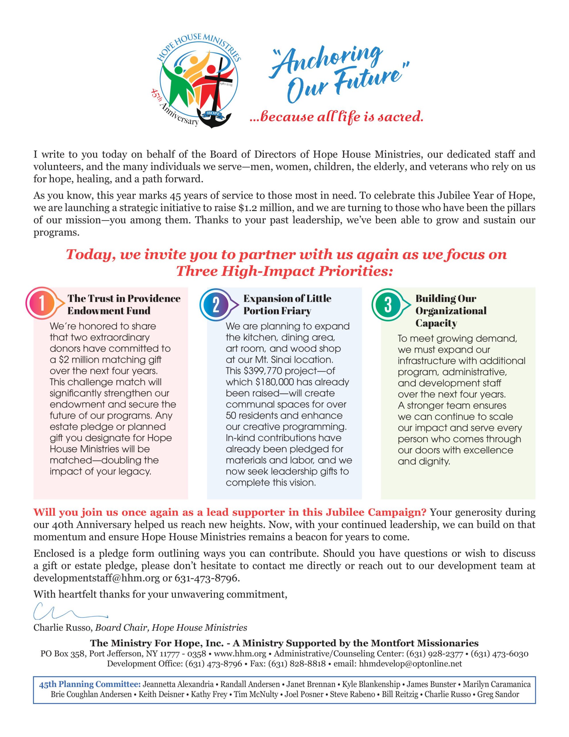 A special mailing will take place in the spring of 2025 outlining the goals of the campaign and explaining in further detail why, at this time in our agency’s history, anchoring our future is so important to those we serve.