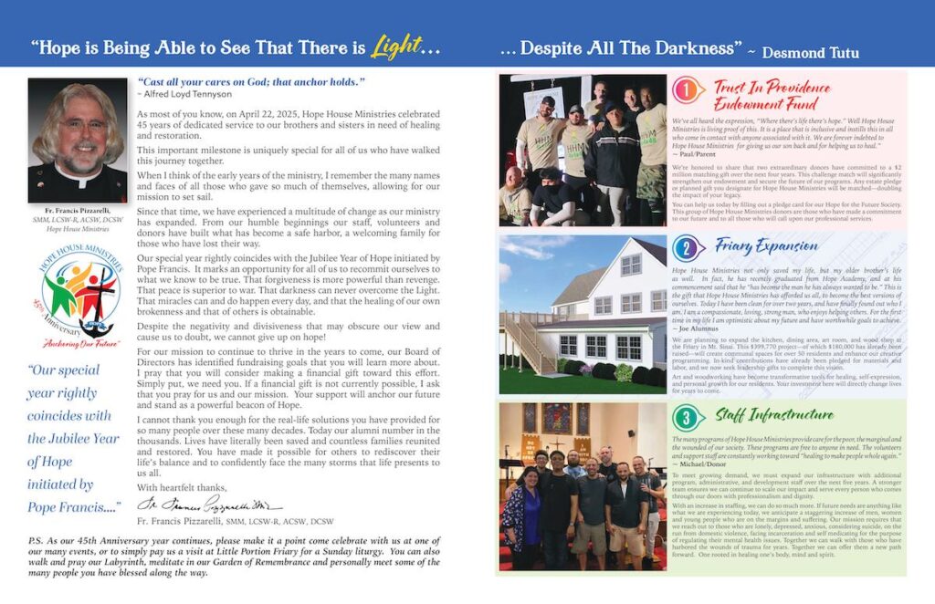 Hope House Ministries has received Bi-Partisan support throughout the years.  In September of 1991 Hope House Ministries was named President Bush’s 555th Point of Light.  In March of 1996 President Clinton appointed Executive Director and Founder of Hope House Ministries, Fr. Francis Pizzarelli, SMM, to his White House Task Force Youth, Drug Use & Violence.